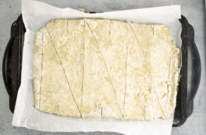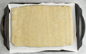 Sprinkle your surface with flour then, using a rolling pin, roll out the dough till you get a 9x13 sized sheet of dough (should be ¼ in. or less. Line a baking sheet with parchment paper then transfer the dough to the baking sheet and cover with saran wrap. Put in the freezer for 15 minutes then flip over and place back into the freezer for another 15 minutes.