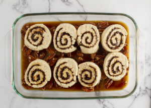 Preheat oven to 350˚F. In a small saucepan over medium-low heat, add vegan butter, brown sugar, and maple syrup, stir until everything is dissolved. Add coconut cream, vanilla extract, and a pinch of salt and stir till incorporated. Remove from heat and pour into a greased 9x13" pan with high sides and sprinkle pecans.