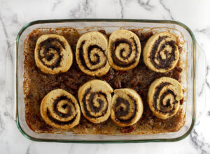 Remove plastic wrap and spread filling mixture evenly across dough's surface. Leave 1" along one short end without any filling, this is where your cinnamon rolls will be sealed.