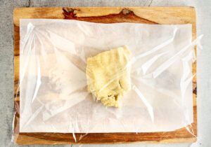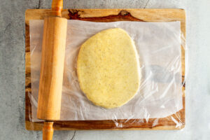 Preheat oven at 350˚F. Remove dough from the fridge and divide into two parts. Keep half in the fridge, covered with plastic wrap. Line your surface with parchment paper and cover the dough with plastic wrap to not stick on the rolling pin.