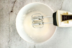 Whisk the chickpea brine and rose water with an electric mixer until foamy and then fold in the icing sugar 1 tablespoon at a time to the mixture until fully incorporated.