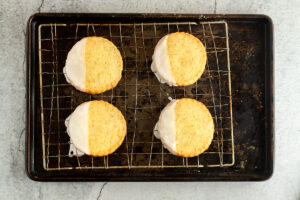 Dip the cookies into the icing and place them onto a cookie sheet. Sprinkle chopped pistachios and serve.