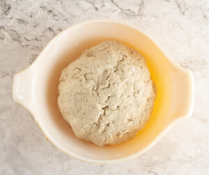 Cover with a moist towel and leave it rise 20 minutes. Then with oiled hands knead it and cover again for 1 hr.