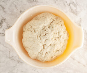Mix on low speed for 1 minute or until the dough comes together. It should be a little sticky to the touch but dry enough to knead. If it is too wet, add ¼ cup of flour at a time until it is dry enough to knead.