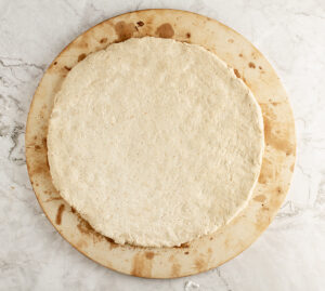 Transfer half of the dough onto a piece of parchment paper that is just big enough to fit onto your baking sheet. Using floured rolling pin, spread dough into a 9-inch (approx. ¼ in. thick) round pizza and using your palms to shape the crust. You can either make the other half now or you can also freeze it.