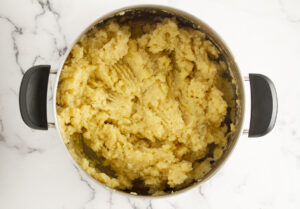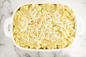 Add the filling into a 9x13 inch baking dish. Smooth it out. Then put the mashed potato on top. Smooth out then create texture with a fork so that the top browns nicely. Spinkle on vegan cheese.