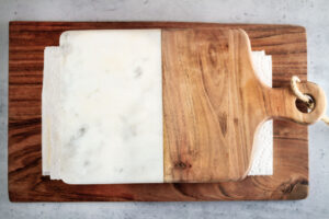 With a clean paper towel, soak up any excess moisture. Then fold up a couple of paper towels to the size of the block of tofu and place it underneath the tofu block. Repeat this on top as well and chose a heavy, flat object and place it on top of your tofu for about 30 minutes.