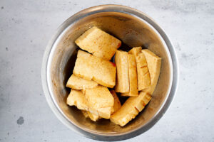 Start marinating your tofu in a bowl by adding all the tofu ingredients. Let sit for 20 minutes while stirring occasionally and flipping sides.
