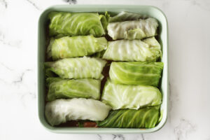 Scoop up about a heaping tablespoon of stuffing into your cabbage leaf and fold the sides first then roll. There will probably be some breakage. I used the torn leaves to close up any broken rolls. This will make approximately 15 rolls.
